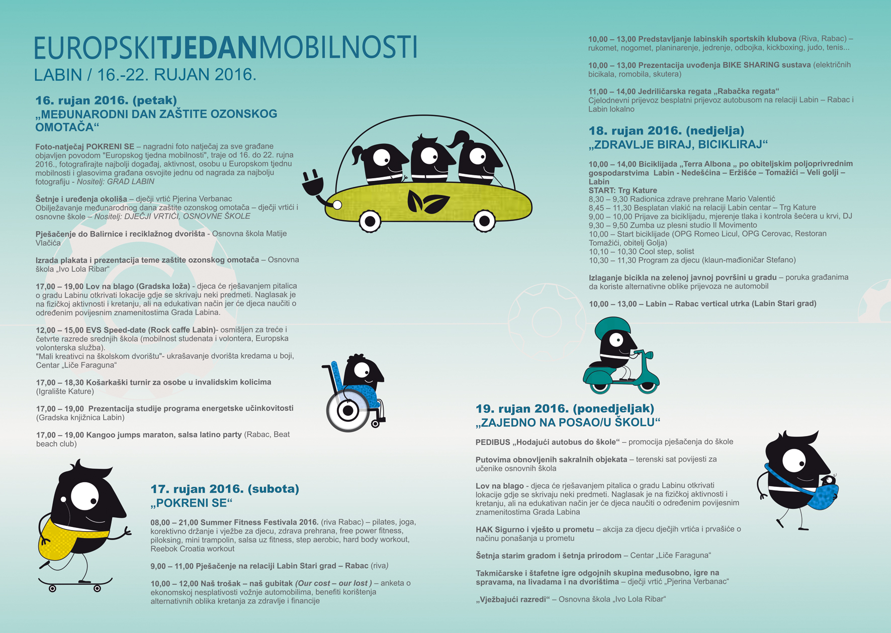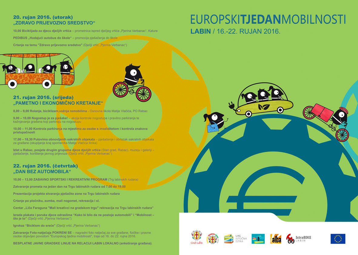 „Dan bez automobila“22. rujan je Dan bez automobila kada ćemo za promet zatvoriti Trg labinskih rudara od 6,00 do 20,00 sati. Prezentirat će se projekt stvaranja pješačke zone na Trgu labinskih rudara, djeca dječjih vrtića crtat će po pločniku i izrađivati plakate i poruke odraslima “Kako bi bilo da ne postoje automobili” i “Mobilnost – što je to”, studio MOVE ME plesat će zumbu, a polaznici Centra „Liče faraguna“ imat rekreaciju na trgu. Nas trgu će se održati prezentacija bike sharing sustava – sustava javnih gradskih bicikala gdje će građani moći isprobati vožnju električnim biciklima, a prigodni glazbeni program na trgu je planiran i u popodnevnim satima.